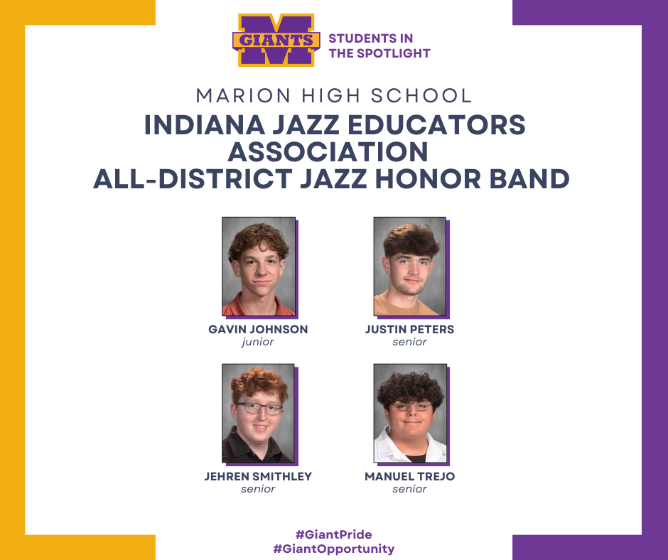 Also on the weekend of Nov. 15 and 16, several Marion students will travel to Pendleton to play with the Indiana Jazz Educators Association All-District Jazz Honor Band, which features select students from around the area in grades nine through 12. They will gather to rehearse together on Nov. 15, then offer a public performance at 4 p.m. Pendleton Heights High School, under the direction of Matt Pivec, Director of Jazz Studies at Butler University.