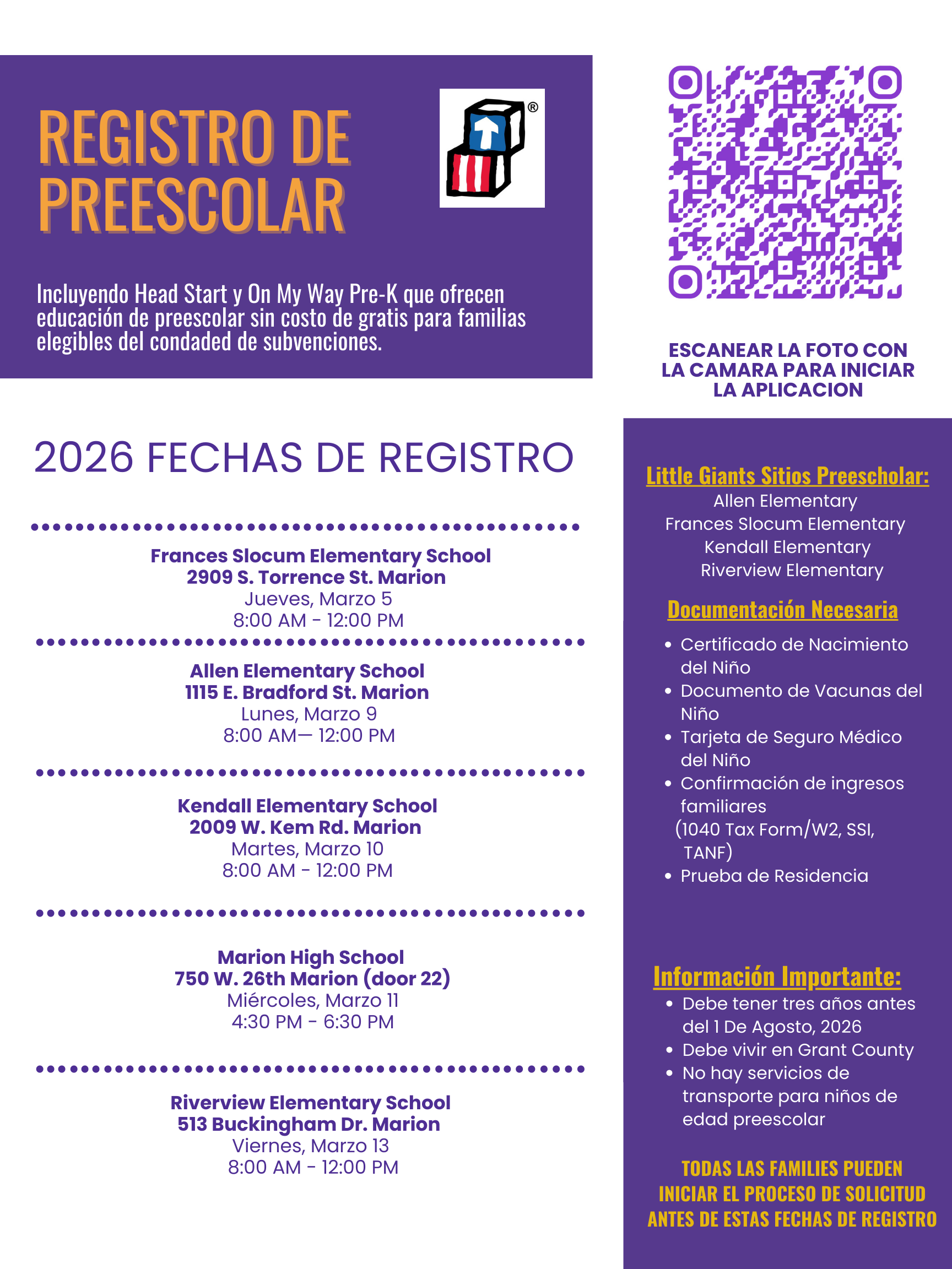 Little Giants Preschool encompasses Marion Community Schools' Head Start, Title I, On My Way Pre-K, and Special Services-funded programs. There are several factors considered when determining which program a student will be enrolled in, but there will be a common start to the application process for all applicants for the 2026-27 school year. Students must be 3 years old by Aug. 1, 2026, and must live in Grant County.